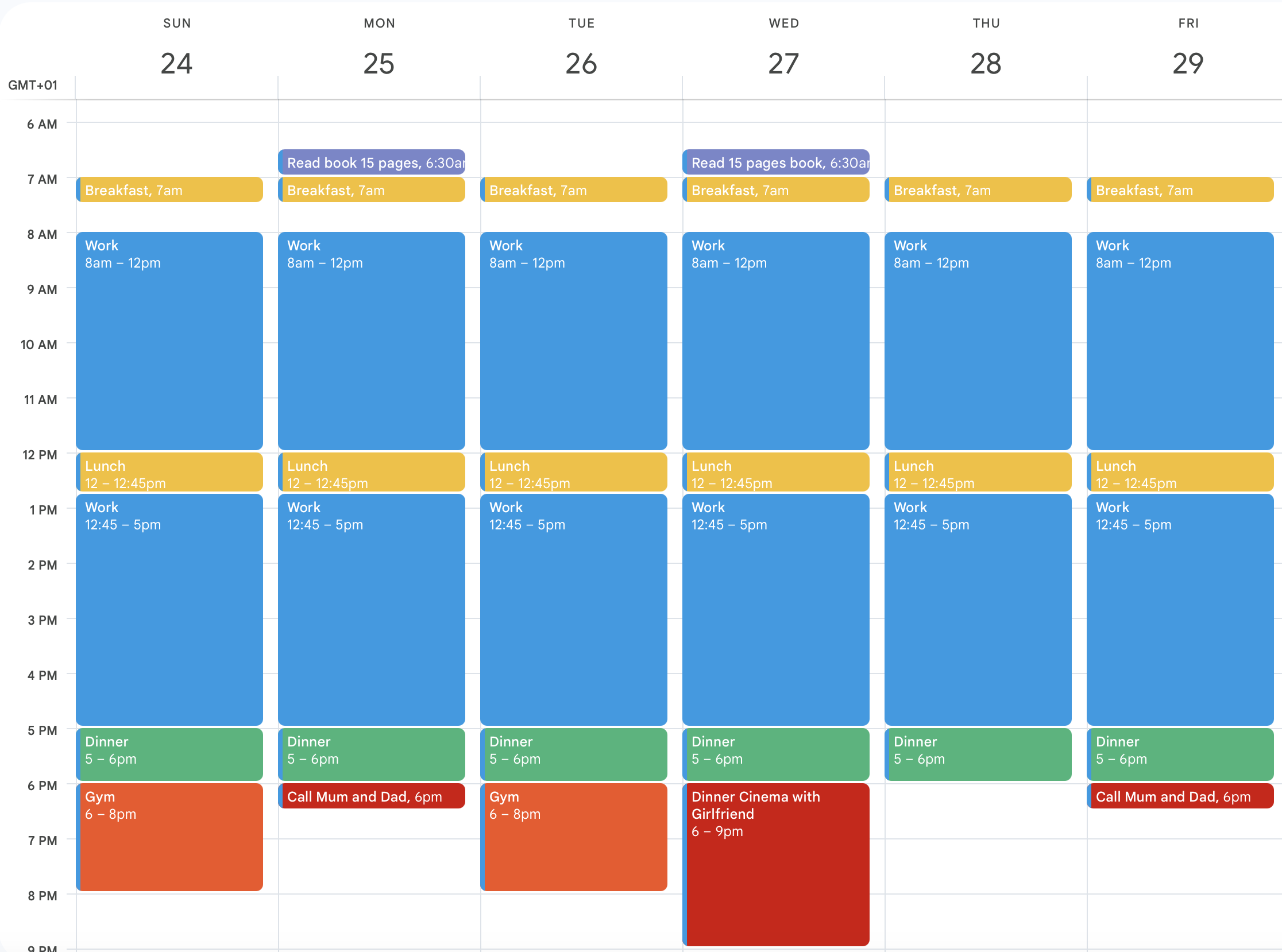 I have created a simplified calendar below. It does not incorporate commuting time or the fact that some tasks can be paralleled like watching a TED during breakfast. This calendar leaves out the weekend.