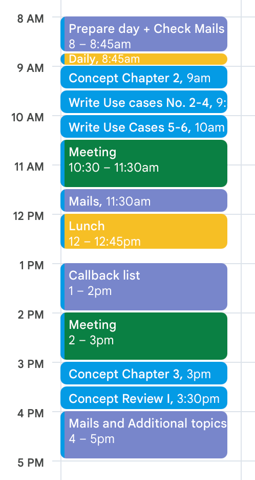 When you plan the day and tasks block slots of 30 minutes for parts of the work, for e. g. a chapter when writing a concept. Elon Musk is known for using the time boxing technique.